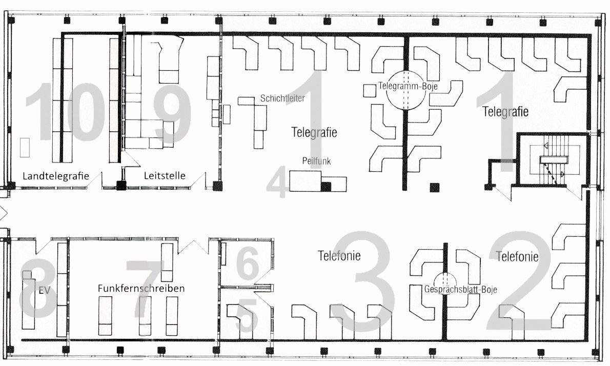Raumplan der Empfangsfunkstelle im Neubau in Utlandshörn. Die technischen Einrichtungen befanden sich ein Stockwerk tiefer.